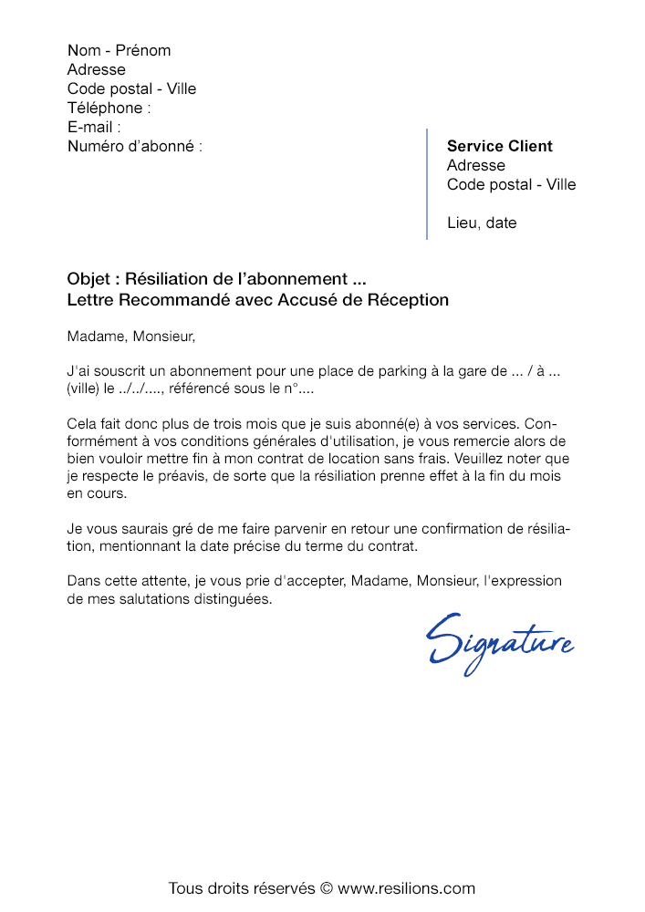 Lettre de résiliation Parking Indigo